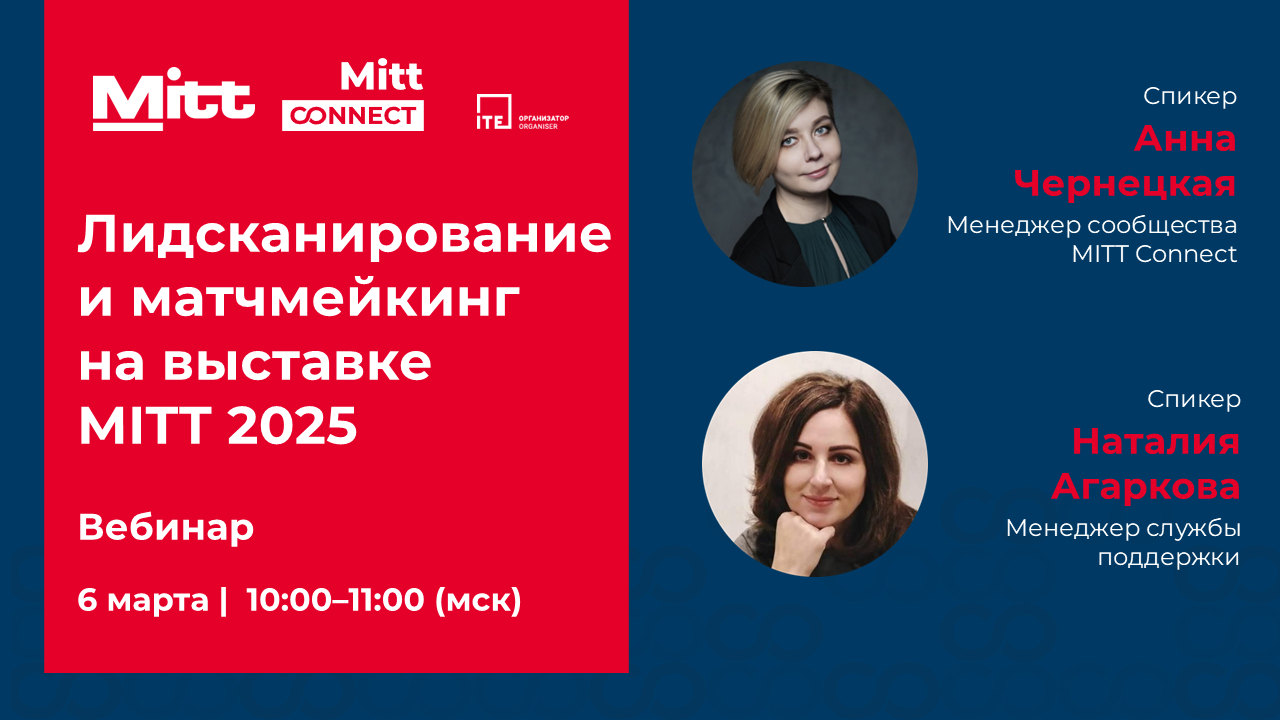 Обсудим, каким образом новые бесплатные сервисы «лидсканирование» и «матчмейкинг» на MITT 2025 позволят составить список потенциальных клиентов до начала выставки, собрать лиды во время её проведения и связаться после выставки с теми, кто не успел подойти на ваш стенд.
