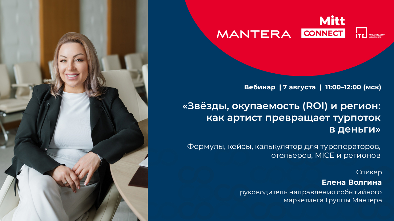 Тема вебинара — «Звёзды, окупаемость (ROI) и регион: как артист превращает турпоток в деньги. Формулы, кейсы, калькулятор для туроператоров, отельеров, MICE и регионов».