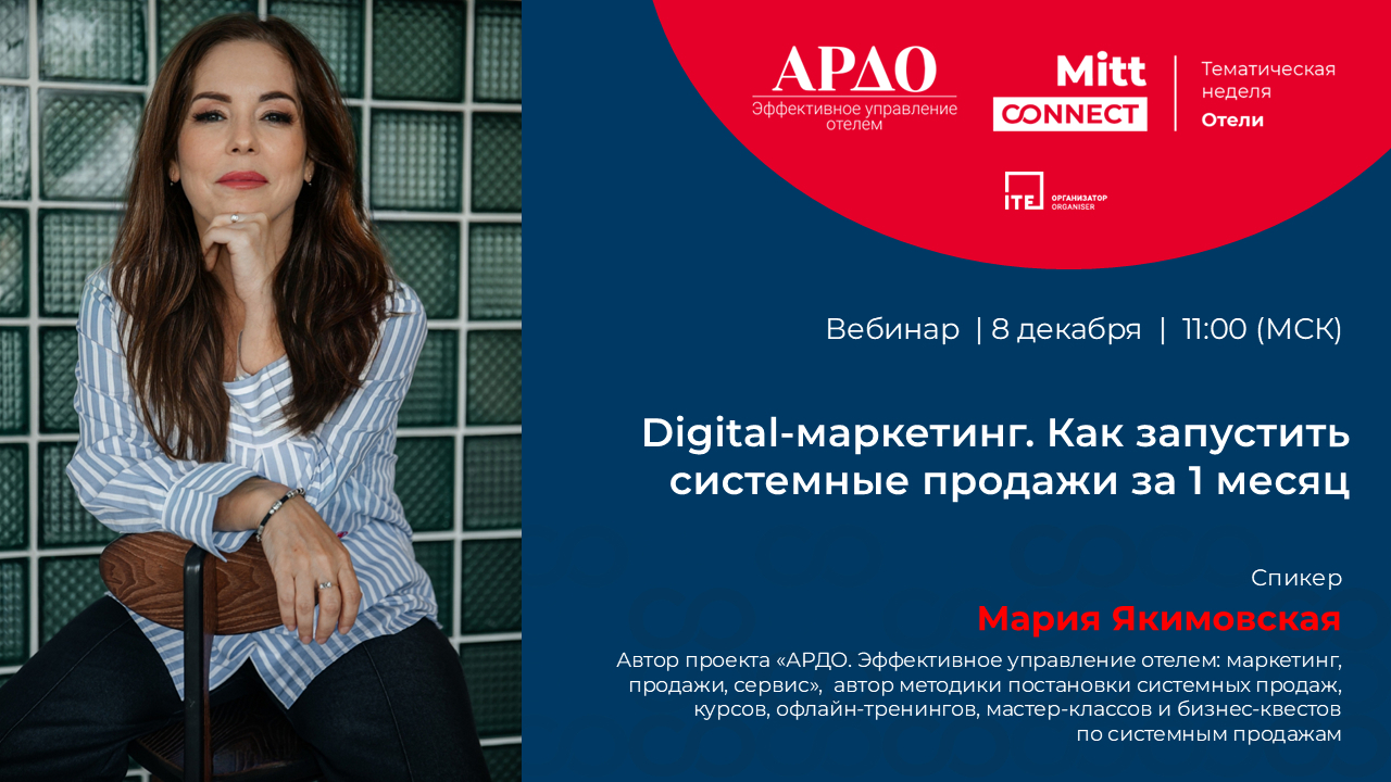 Спикер — Мария Якимовская, автор проекта «АРДО. Эффективное управление отелем: маркетинг, продажи, сервис», включающего агентство по постановке системных продаж и комьюнити отельеров в соцсетях.