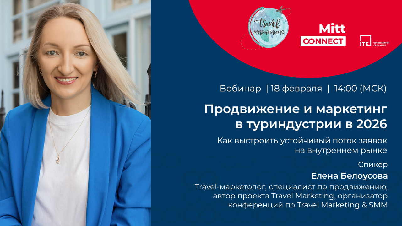 18 февраля в 14:00 приглашаем на вебинар «Продвижение и маркетинг в туриндустрии в 2026. Как выстроить устойчивый поток заявок на внутреннем рынке».