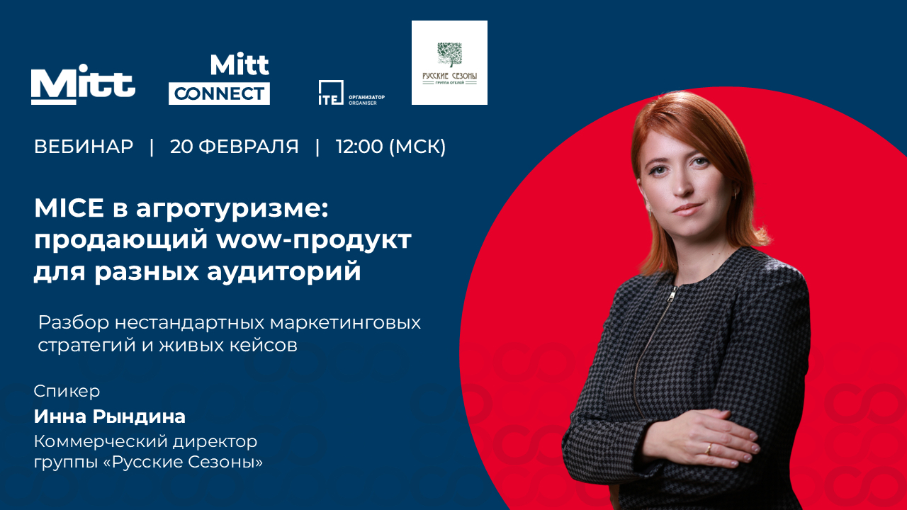 20 февраля в 12:00 (МСК) ждём вас на вебинаре «MICE в агротуризме: продающий wow-продукт для разных аудиторий». И это не просто вебинар — в эфире вас ждут разборы нестандартных маркетинговых стратегий и живых кейсов.